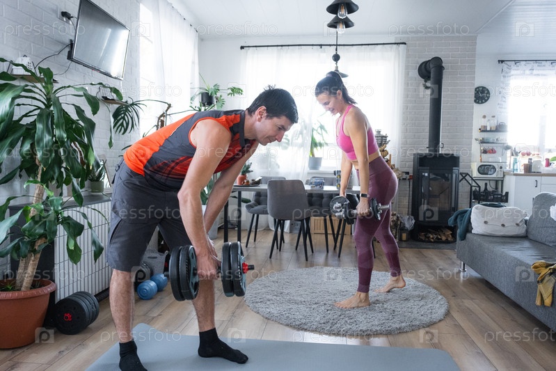 Семейные виды спорта в домашних условиях, парные растяжки, тренировочные коврики, удобная гостиная, зеленые растения, мотивация, взаимное благополучие, совместное хобби