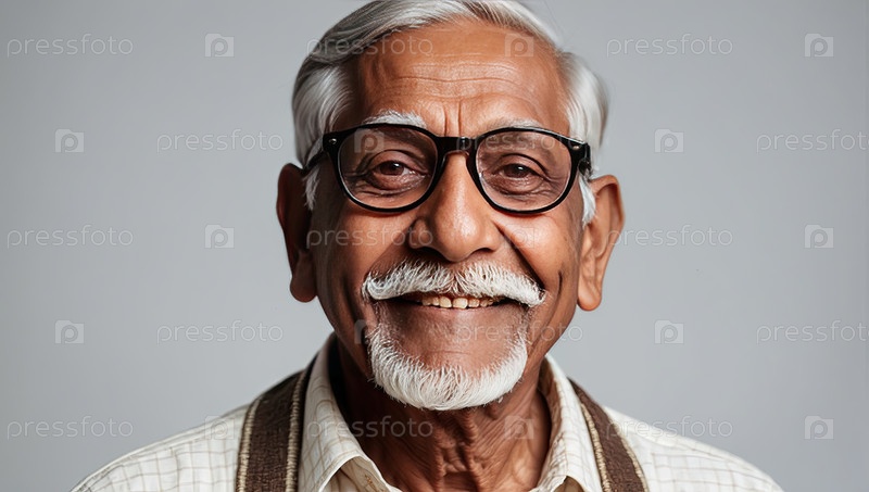 Пожилой человек с большими очками, усами, белой рубашкой, улыбкой, студией. снижение зрения с возрастом, обновление кадра, руководство по уходу за престарелыми, промо оптической компании, область ярких моментов истории