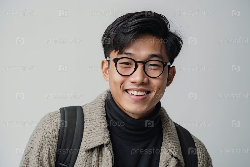 Улыбающийся азиатский мужчина с очками, рюкзак, серый фон, студенческий городской образ жизни, защита цифрового зрения, фильтр синего света, мотивация для молодежи, зона баннеров