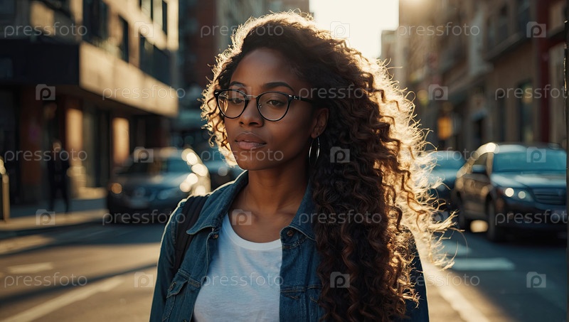 Молодая чернокожая девушка в круглых городских очках, джинсовой рубашке, кудрявых волосах, золотом солнечном свете. борьбы с коррекцией, выразительная ценность стиля, молодежь большого города, содержание блога и клиники, место для текста