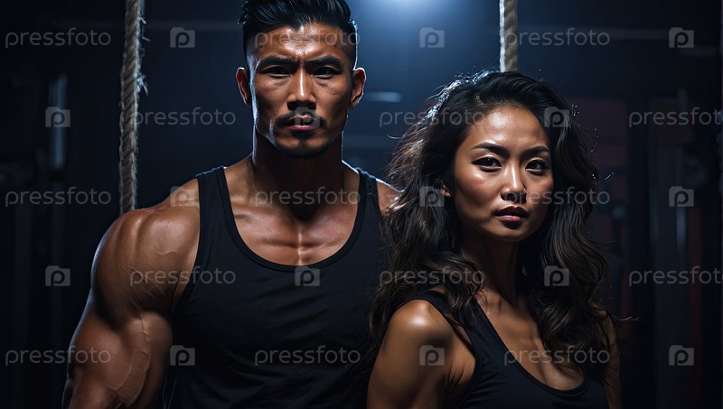 Атлетические азиатские мужчины и женщины-тренеры в тренажерном зале, профессиональная тренерская команда, сотрудники спортивных клубов, мотивационный портрет, оздоровление, использование рекламы, текстовое пространство