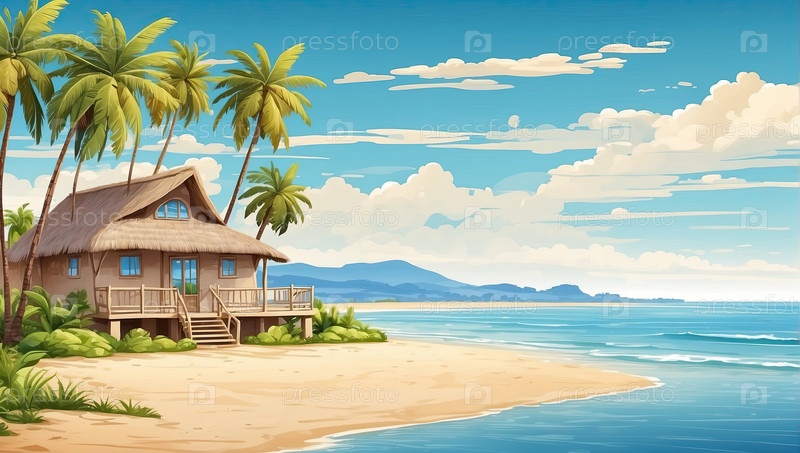 Тропический бунгало с видом на чистое море, частный комплекс "все включено", семейные каникулы, тихая иллюстрация цифровой живописи