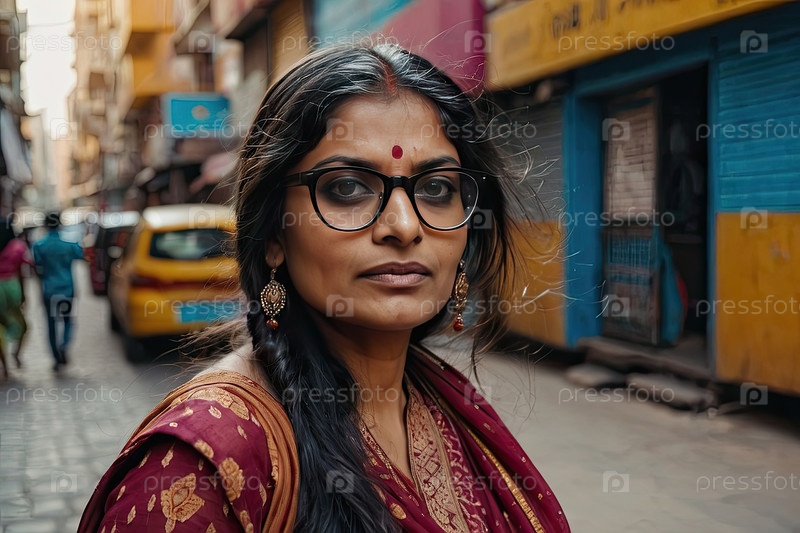 Зрелая южноазиатская женщина с очками, красочное сари, городская улица, выглядит обеспокоенно, проблемы со зрением, нуждается в линзах по рецепту, фон города, копирайтинг