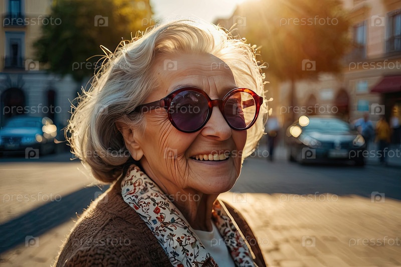 Веселая пожилая белокожая женщина в больших солнцезащитных очках, солнечная городская улица, поддержка зрения, профилактика глазных заболеваний для престарелых, позитивный образ жизни, стиль баннера, пространство для текста