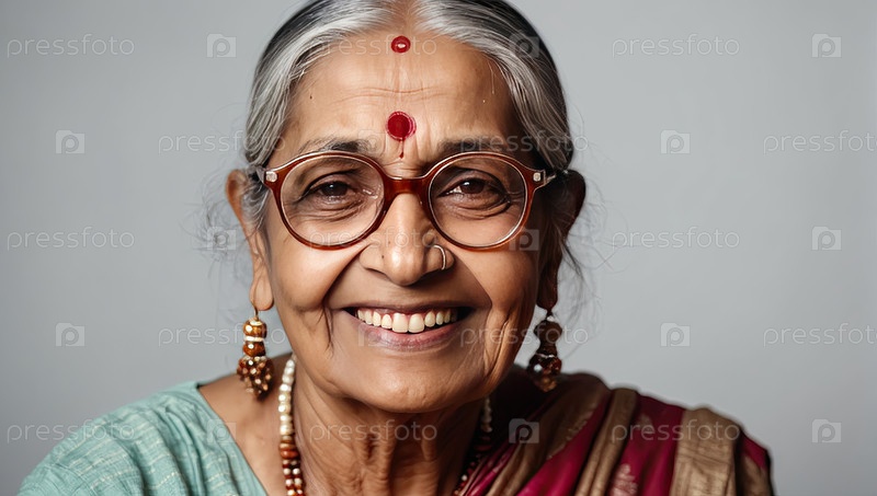 Пожилая южноазиатская женщина с бинди, очки среднего размера, голубое сари, студия, нежная улыбка. проблемы со чтением, выбор оптики, лучшие советы для пожилых людей, медиа здоровья, зона кописпейса