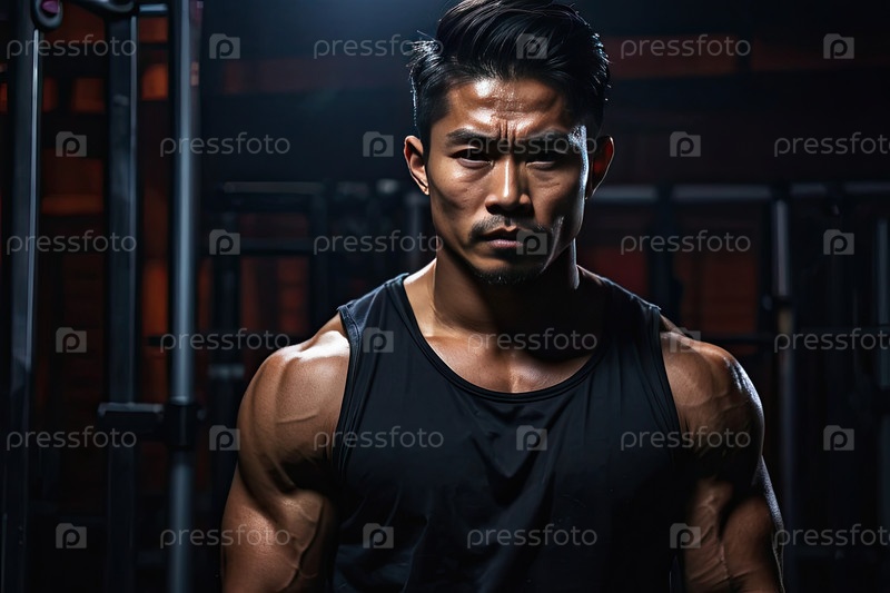 Фитнес-портрет азиатского мужского тренера в тренажерном зале, спортивный тренер, спортсмен, бодибилдинг, силовые тренировки, персонал клуба, веб-промо, пространство для текста