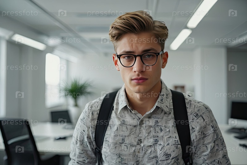 Стильный молодой офисный работник в очках, современное рабочее место, технологии, оздоровление зрения, цифровой образ жизни, коррекция очков, деловая уверенность, пространство для текста