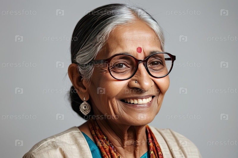 Пожилая индийская женщина в очках, плетеные волосы, сари, радостная, съемка в студии. трудности с чтением, уход за зрением, традиционный старший стиль, разнообразие в медицине, пространство для оформления блога