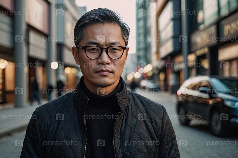 Молодой азиат в темной куртке, очки, городская улица, задумчивое лицо