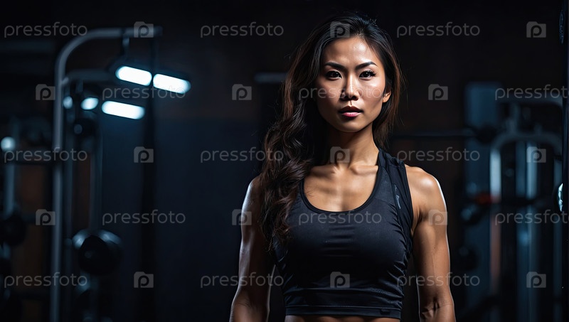 Азиатская женская фитнес-тренера с уверенным внешним видом, спортивная одежда, тренажерный зал, личный спортсмен, оздоровительный клуб, упражнения, портрет персонала, тренировочная зона, текст для брендинга