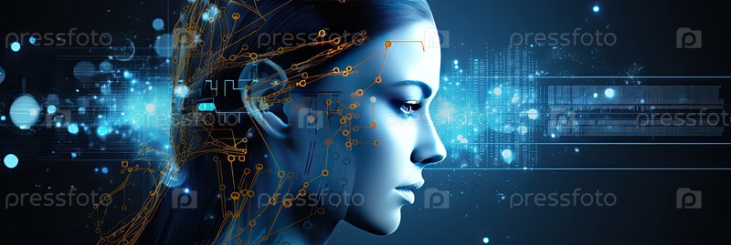 Синий футуристический портрет женского интерфейса ИИ, технологии и интеллекта, затемненная правая сторона для заголовка или сообщения в рекламном дизайне