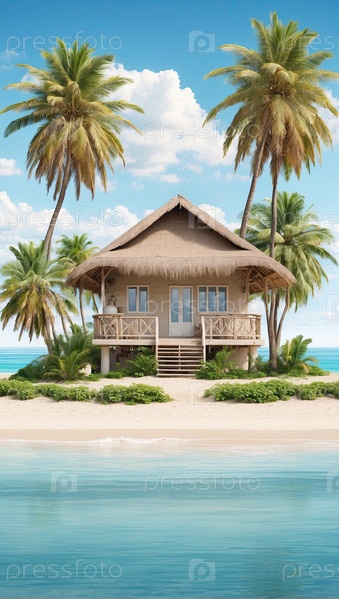 Бунгало на солнечном тропическом пляже, частная вилла "все включено", красочный пальмовый оазис, цифровые мультфильмы для бронирования путешествий
