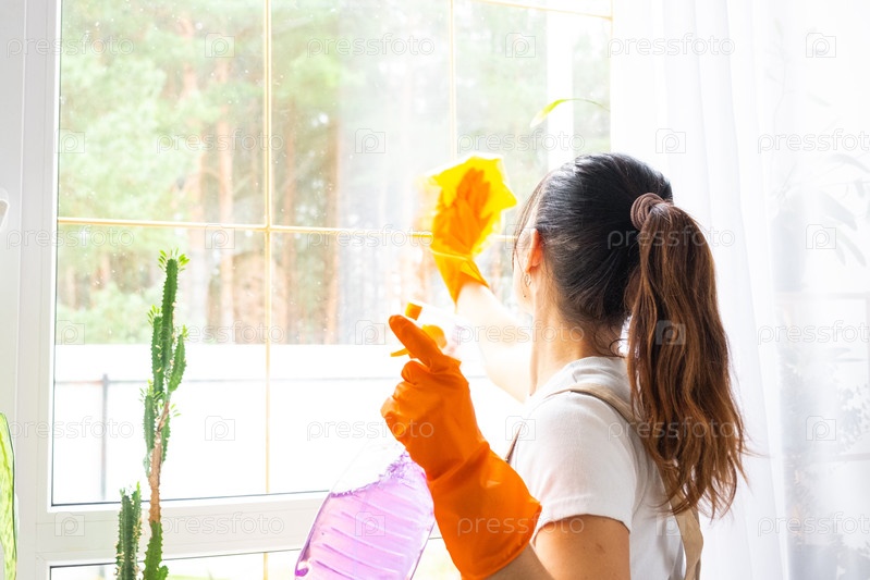 Молодая брюнетка моет окно в перчатках и фартуке, домашняя уборка, горшочное растение на окне, кухня, яркий интерьер, продвижение клининговой компании, уход за стеклом