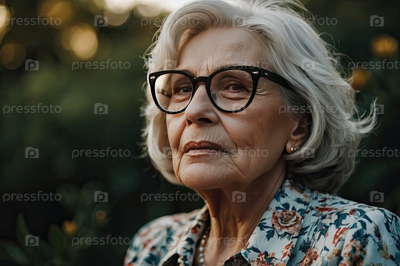 Пожилая кавказская женщина в серых очках, короткие локоны, окно светит, домашние растения, плакатный кардиган. возрастная потеря зрения, диабетический отек желтого пятна, мультифокальная проблема, информация здорового образа жизни,