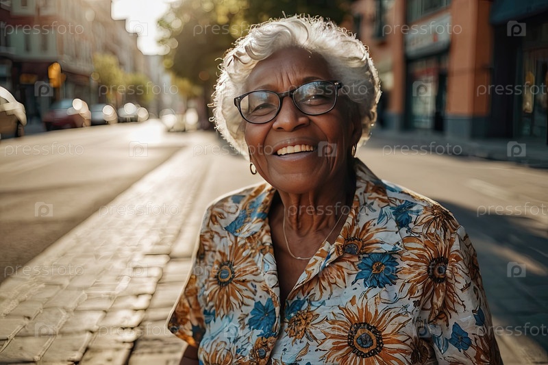 Афроамериканская женщина в шикарных современных очках, смелое ожерелье, апельсиновый шарф, проспект Заката, радостная. макулярная дегенерация, размытое зрение, сухое око, поддержка центра помощи, рекламный баннер для клиник, оптик