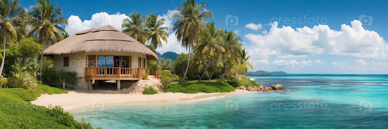 Бунгало с садом у голубого океана, частный семейный курорт со всем включенным, тропическое спокойствие, иллюстрация мультфильмов цифрового искусства