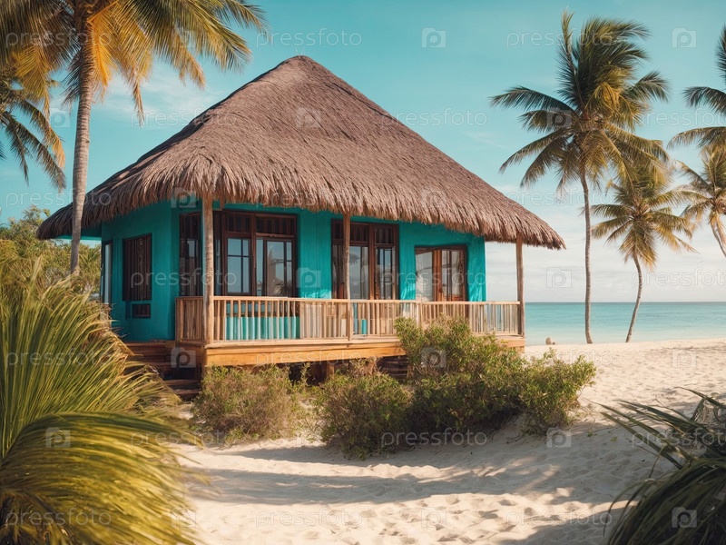 Стильный бирюзовый бунгало на тропическом пляже, частное все включено жилье, островный туризм, летний отдых