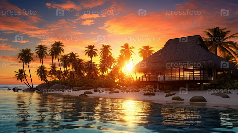 Бунгало у пальмовой лагуны на закате, частная семейная вилла "все включено", тропическая роскошь, отдых, цифровые иллюстрации рисунков из мультфильмов