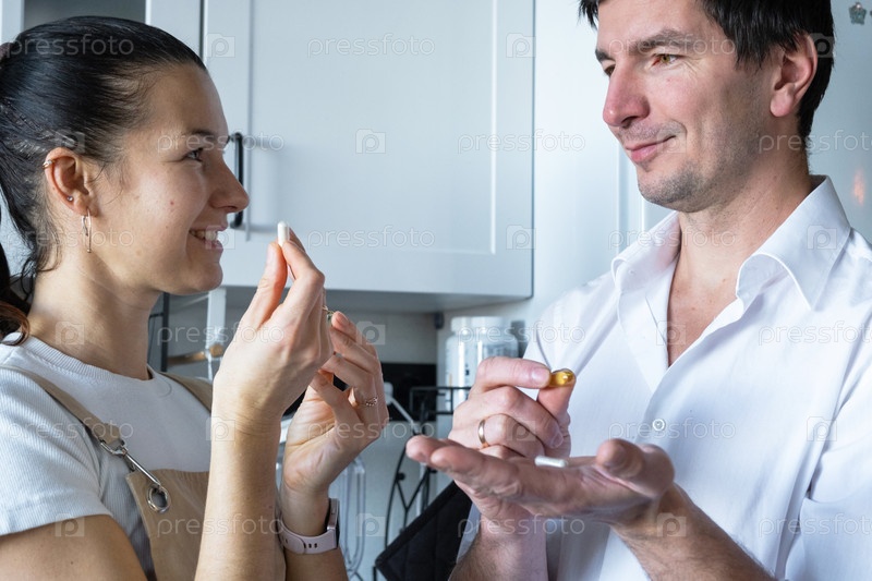Муж и жена принимают витамины, семейное здоровье, продвижение пищевых добавок, витамин С, витамин D, мультивитамин, продукт оздоровления ad
