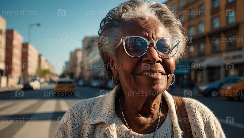 Пожилая чернокожая женщина с уникальными овальными солнцезащитными очками, коричневым пальто, городским утром, широкой улыбкой. астигматизм, пресбиопия, риск глаукомы, рекламные листовки для событий в области здоровья, наружный баннер