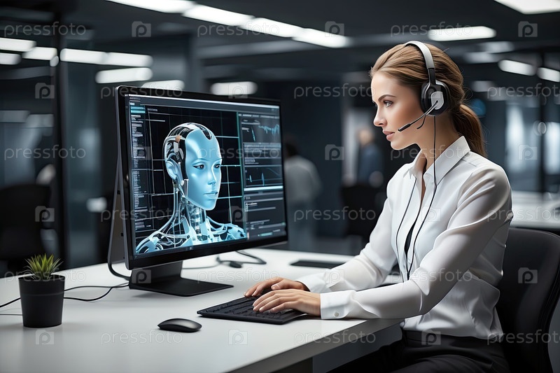 Деловая женщина работает с искусственным интеллектом на компьютере в современном офисе, сотрудничая над разработкой программного обеспечения, коммуникацией и будущим технологическим партнерством