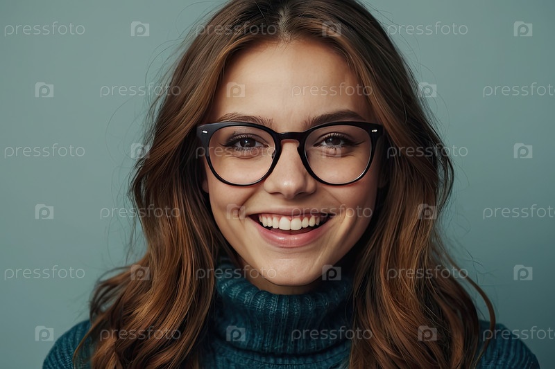 Молодая европейская девушка в больших ретро-очках, уютный свитер, волнистые светлые волосы, бледно-синий фон