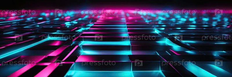 Футуристический цифровой фон с голубыми розовыми неонными полосами, светящийся эффект сетки на полу, яркий киберпанк-дизайн, современный научно-фантастический баннер, рекламная акция технологического мероприятия