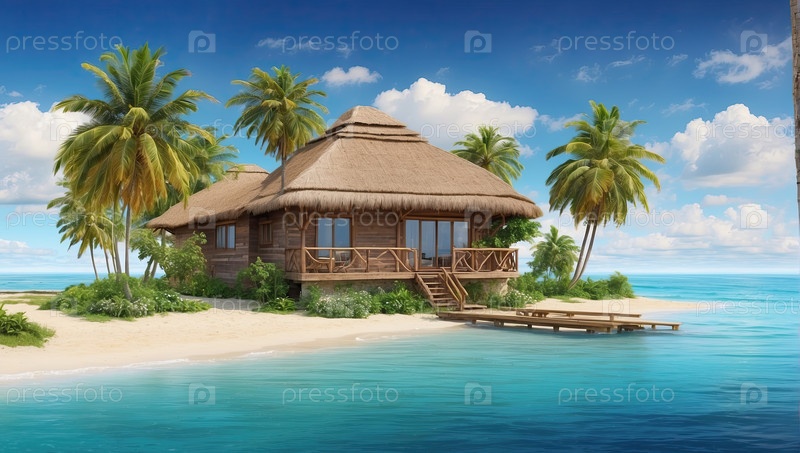 Тропический бунгало на золотом песке, семейная вилла "все включено", частный рай, роскошный курорт, цифровая иллюстрация мультфильмов, отдых