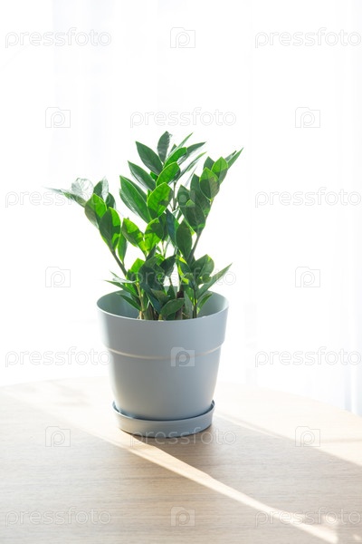 Замиокулька, укорененная в горшке на столе рядом с окном, рутина ухода, полив, опыление, мало солнца, современный минималистический интерьер, использование в растительном магазине ad