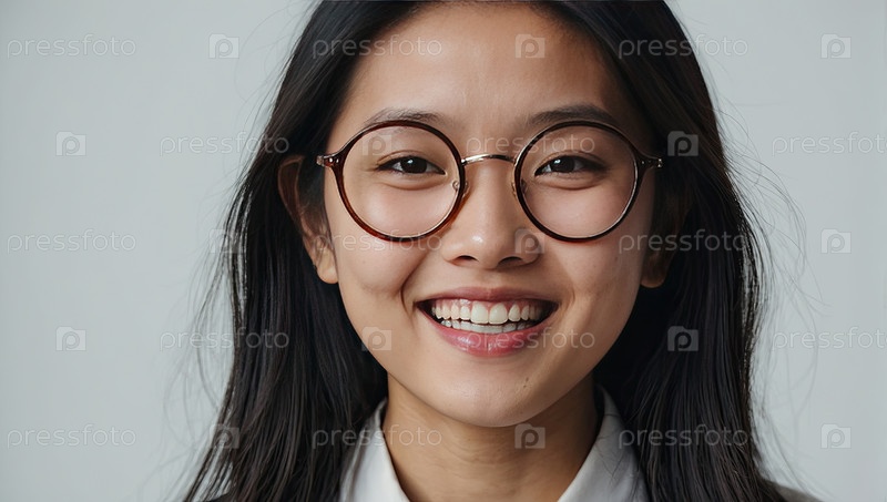 Азиатский подросток в современных овальных очках, черные волосы, студия, нежная улыбка, серый фон. проблема со зрением, стиль подойдет, универсальная рама, образовательные материалы, блог, экраны приложений, область копирования