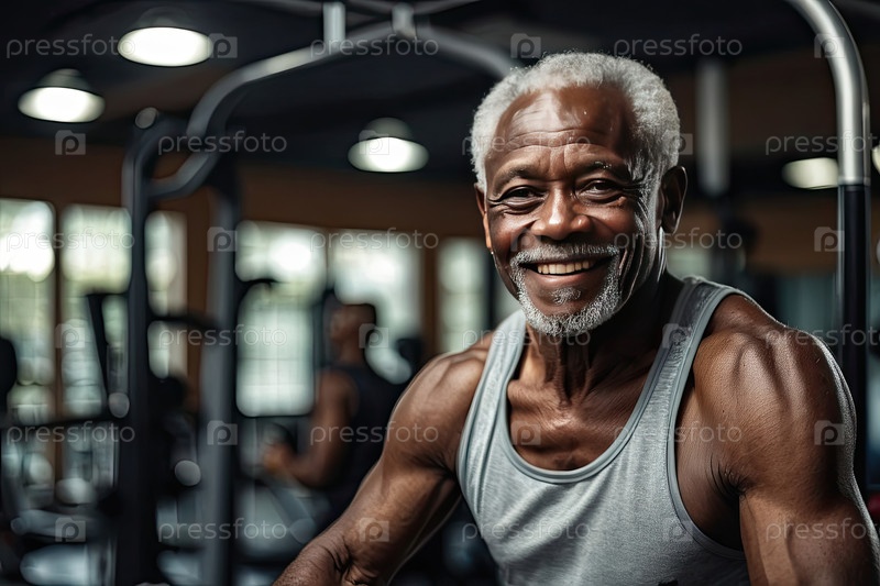 Афроамериканский мужчина старшего возраста, около 70 лет, в сером танковом топе, тренажерном зале, фитнес-одеждах, сильный, здоровье, улыбающийся, оздоровление, активный, старший тренинг, редакционная работа, использование рекламы, текст