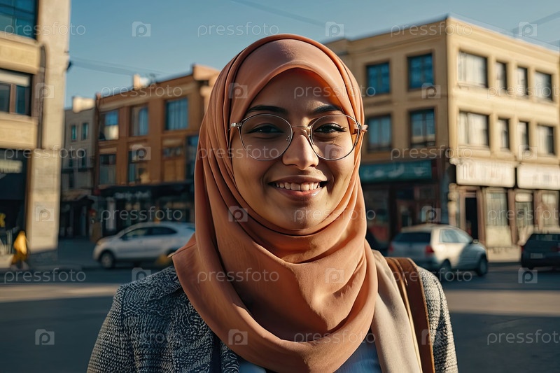 Арабская женщина в оранжевом хиджабе и очках улыбается на городской улице с пространством для текста, коррекции зрения, очков, уверенности, оздоровления, здорового образа жизни, оптометрии, современного взгляда