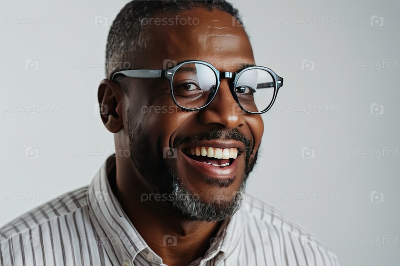 Афроамериканский взрослый мужчина, носящий очки, улыбающийся в студии, нейтральный фон. проблемы со зрением, необходимость коррекции, выбор очков, позитивное настроение, место для текста