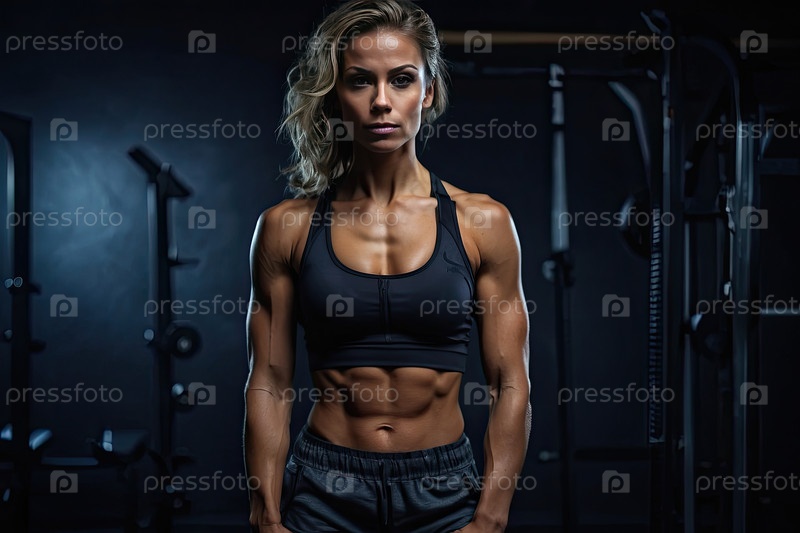 Спортивный кавказский женский фитнес-тренировщик с мускулистым строением, тренажерный зал, профессионал, персонал клуба, спортивная одежда, здоровый образ жизни, портрет, рекламное изображение, текстовое пространство