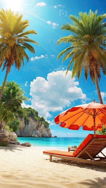 Яркая сцена на шезлонге с оранжевым зонтиком, туристический комфорт, тематика оздоровления, релаксация, безопасность от солнца, много текстового пространства в небе