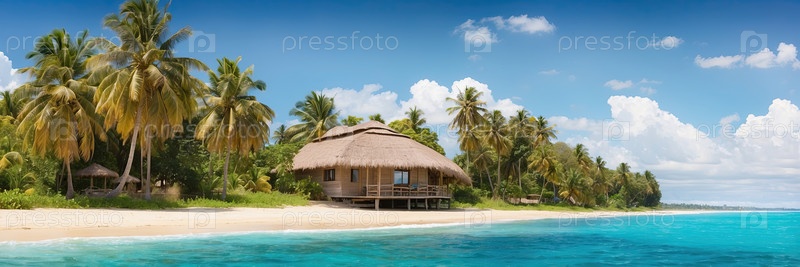 Роскошный бунгало с панорамным видом на бирюзовый залив, эксклюзивное отдых со всем включенным, частное пребывание на берегу океана, цифровая иллюстрация