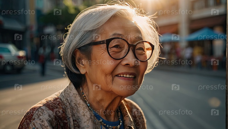 Пожилая женщина в круглых очках, кудрявые белые волосы, свет города на открытом воздухе, радостное лицо. пресбиопия, диабетическая ретинопатия, проблемы со зрением деталей, реклама для повышения осведомленности, старшие медиа-интервью, текстовая зона