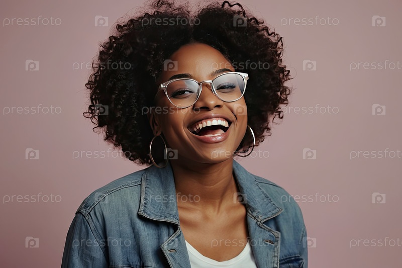 Улыбающаяся афроамериканская девушка в белых ацетатных очках, локоны, открытая куртка, пастельная фотозона. трудности с выбором оптики, современный стиль, свежий внешний вид, блог медицинские советы, промо соцсетей