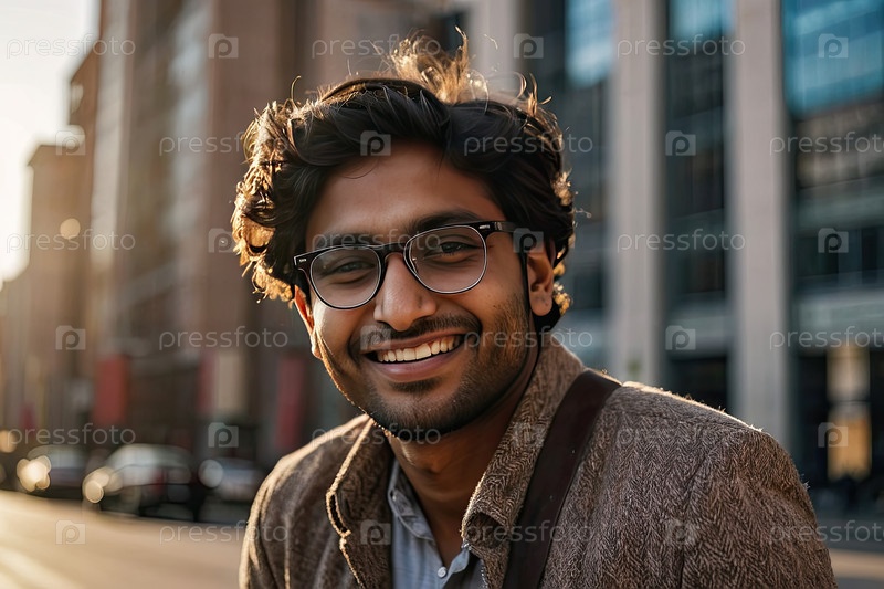 Молодой южноазиатский мужчина в деловой куртке, городской вечерний свет, студент университета, сталкивающийся с напряжением глаз из-за технологий, здоровый городской образ жизни, текстовая зона для консультаций по здоровью