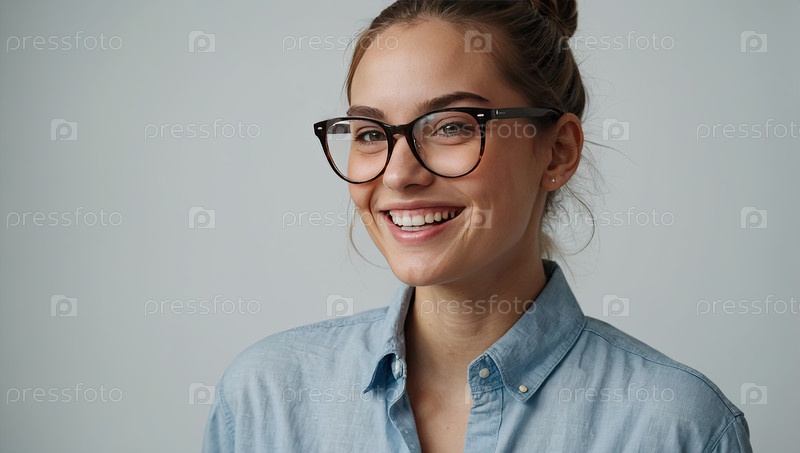 Молодая девушка в полупрозрачных очках, синяя рубашка, волнистые волосы, студия, свежая улыбка. коррекция раннего зрения, модная форма, онлайн-образование, цифровое продвижение/приглашение на консультации или мероприятия, текстовый ящик