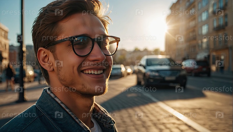 Улыбающийся молодой человек в очках, улица заката города, студент университета, современная городская мода, стресс цифрового зрения, поощрение здоровых глаз, пространство для текста объявления