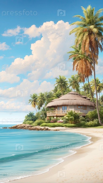 Бунгало у берега голубой лагуны, частная летняя аренда со всем включенным, райский курорт, семейные путешествия, иллюстрация цифровой живописи