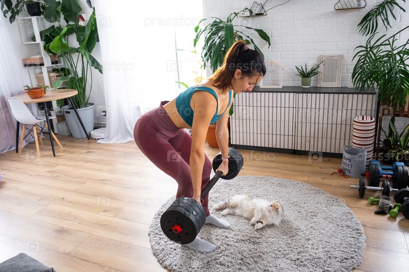 Молодая женщина, занимающаяся фитнес-упражнениями дома с гантеликами, кошачий кот, лежащий поблизости, уютный образ жизни, здоровая рутина, домашний компаньон, домашняя деятельность