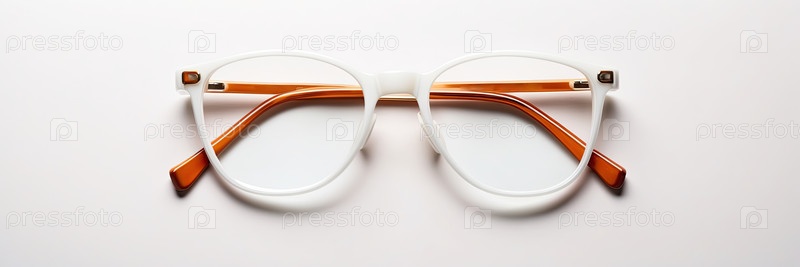 Стильные коричневые очки, расположенные на мягком белом фоне, минимальный дизайн для витрины оптики, офтальмологии или имиджа бренда, пространство копирования