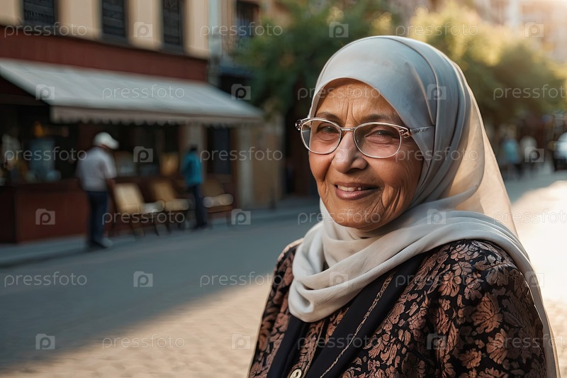 Арабская женщина в синем хиджабе и очках улыбается на улице с пространством для текста, коррекции зрения, инклюзивности, очков, городского образа жизни, офтальмологии