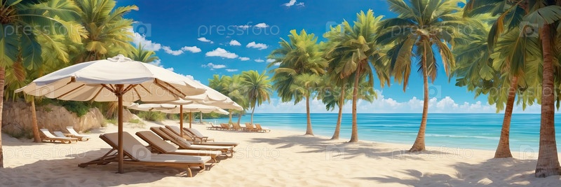Сетчатые зонтики и шезлонги на тропическом побережье, реклама путешествий, защита от солнца, развлечения, комфорт, летний сюрприз, пространство для маркетингового текста