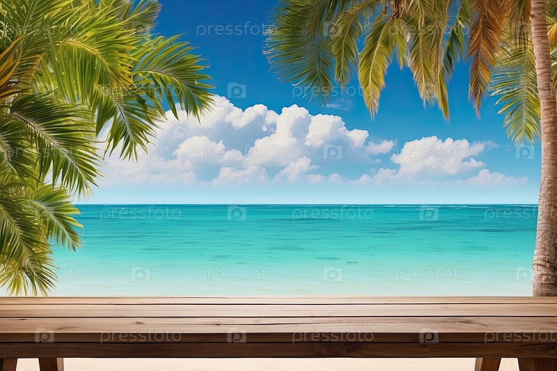 Тропический фон с деревянной доской, пляжный отдых, маркетинг, веб-баннер, стенд демонстрации продукта, чистая зона для текста и логотипа