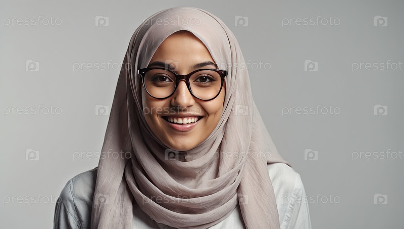 Молодая арабская женщина в легком хиджабе и очках улыбается в студии с пространством для текста, коррекции зрения, очков, уверенности, оздоровления, женского стиля, разнообразия, здравоохранения