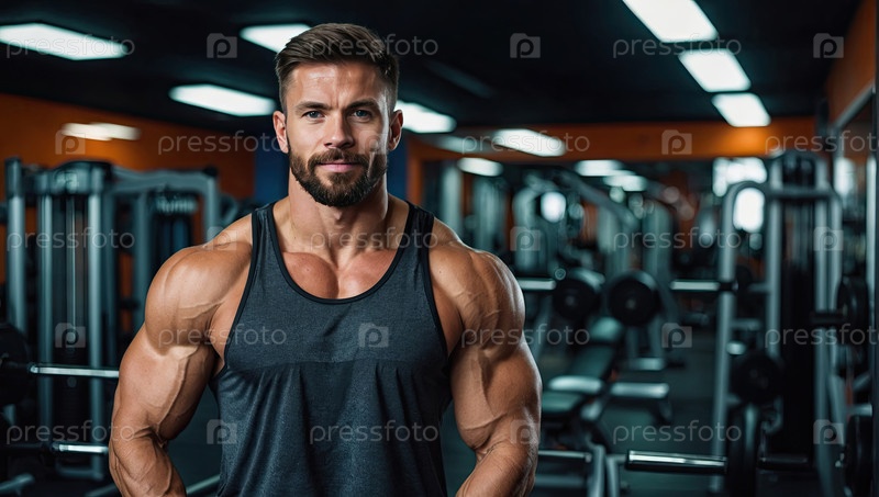 Мускульный кавказский мужчина личный тренер, стоящий в фитнес-клубе, профессиональный спортсмен из тренажерного зала, сила, мотивация, клубный портрет, текстовая зона
