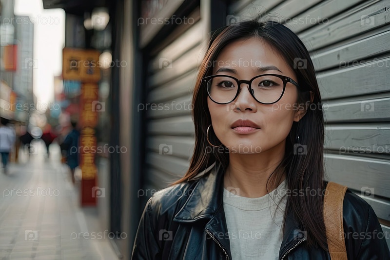 Молодая азиатская женщина с круглыми очками, кожаным пальто, стоящая против современного металлического жалюзи, задумчивое лицо. проблема взрослого зрения, дилемма рамки, городской стиль, место для текста